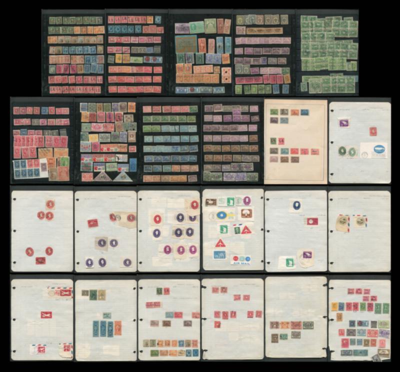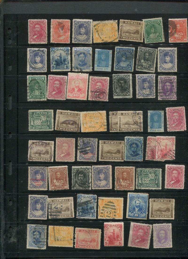A mostly used Hawaii 1864-1899 #30/#82 grouping on a stocksheet. Includes two #5 forgeries, #36 (2), #40, etc. Fine to f-vf throughout. (Image)