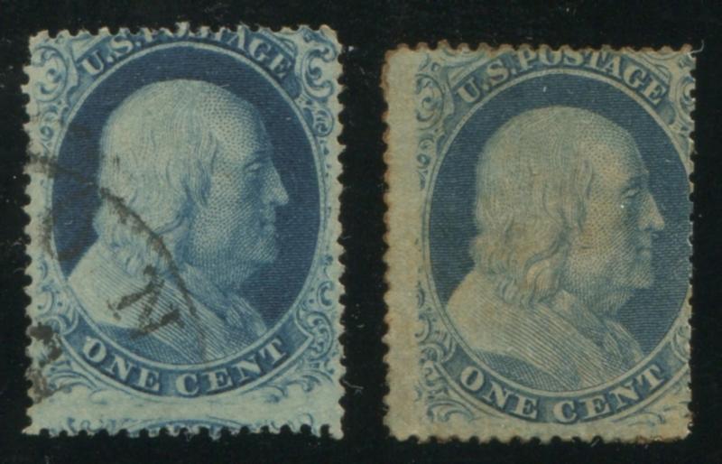 USA 1857 #22/#24 1c Blue Used VG/Fine. #22 with light face free cancel, deep, bold rich colour, good even left and right margins, into at top, but super jumbo lower margin showing top of stamp underneath. #24 shifted to UR, barest trace of cancellation, some trimmed/pulled perfs at right. Scott- $512. (Image)