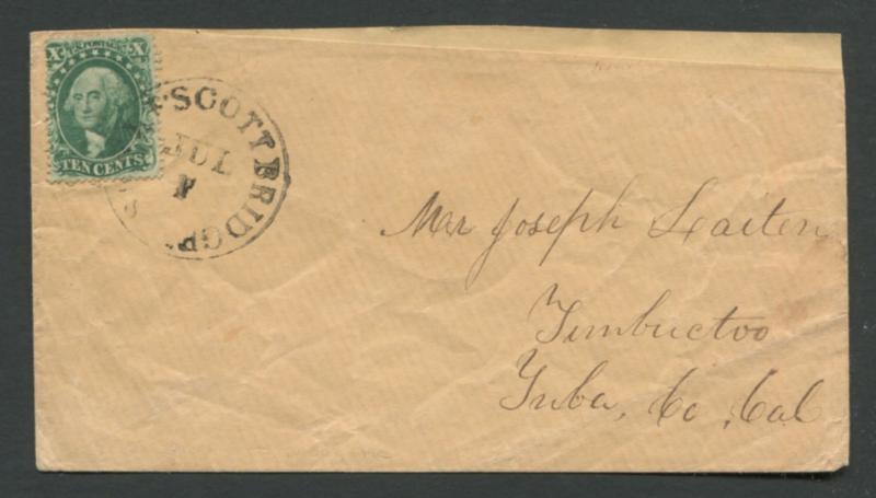 USA 1857 - 1861 #32, tied by Sheepscott Bridge CDS on cover to California, has bends and wrinkles and part of backflap missing, otherwise appears fine (Image)