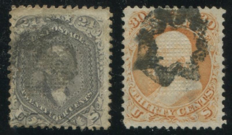 Two 'F' Grill examples, USA 1867 #99 24c VG, and USA 1867 #100 30c Orange with a very light thin. Scott- $2,450. (Image)