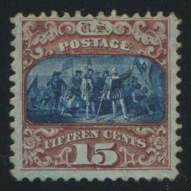 USA 1869 #119, a MH 15c brown & blue, Landing of Columbus, type II, with a rich colour, has 2014 PSE Cert, Scott value $3250, appears f-vf (Image)