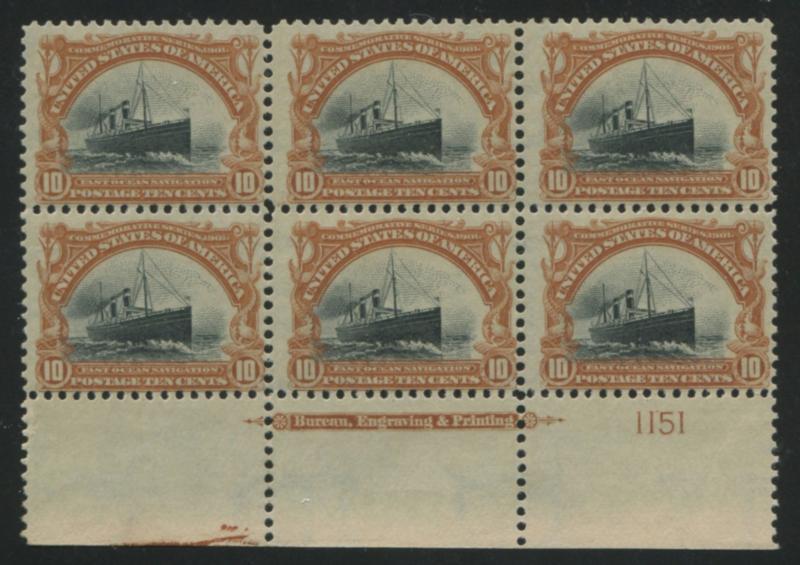 USA 1901 #299, a LH, bottom margin plate block of six, with "Bureau Engraving and printing - 1151", Scott value $6750, has 2017 PSE Cert, appears f-vf (Image)