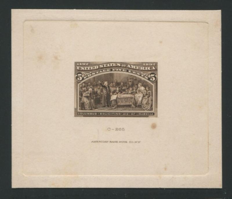 USA 1893 #234P, a large die proof on card, of the 5c Columbian, measures 83 x 72mm, has a few small toning spots, otherwise appears f-vf (Image)