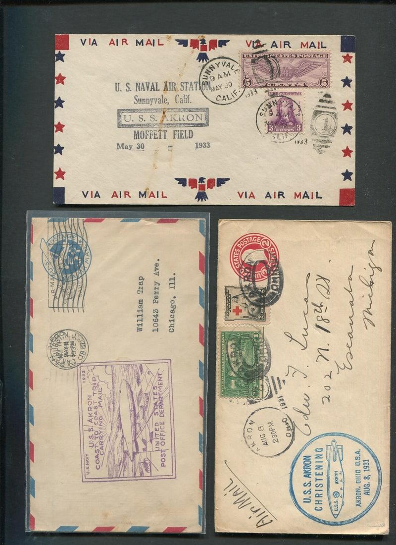 Topicial - US Naval Airship covers 1931 -1933, three USS Akron covers, August 8 1931 Christening of the ship, May 8, 1932 Coast to Coast leaving Lakehurt, May 300, 1933 Sunnyvale to Moffett Field, all with catchets, appears f-vf (Image)