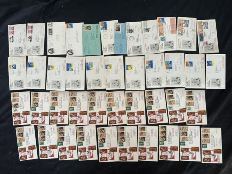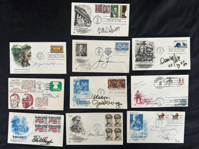 USA 1959 -1984, a group of 10 US FDCs signed by various famous people and movie stars, incluiding Willard Scott, Ginger Rogers, James Stewart, Bob Hope, Alger Hiss, Whoopi Goldberg, Dom de Louise, James garner, Seymour Hersh and US ARMY General, all of these are sold "as is" there is no gurantee of these being geninue, s f-vfappear (Image)