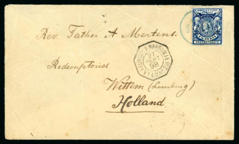 1898 Envelope from Mombasa to Rev. Father A. Mertens in Holland, franked on the reverse with 4a marginal tied by "Smith Mackenzie & Co" hs and Zanzibar transit, in combination with BEA 1896-1901 2 1/2a blue tied by blue thimble Mombasa cds in transit, French paquebot "L.U. No.2" octagonal ds, Wilre arrival, a fine and scarce usage. (Image)