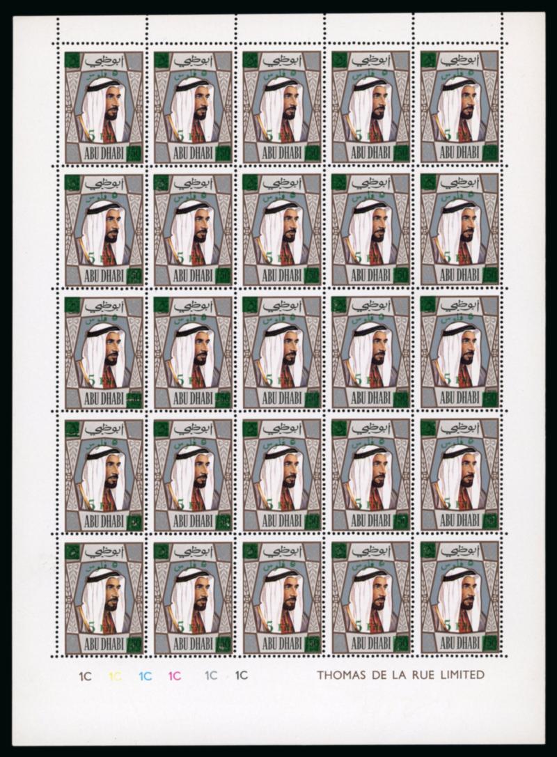 image Abu Dhabi 1971 5f on 50f Shaikh Zaig in mint n.h. complete sheet of 25, fresh. (Image)