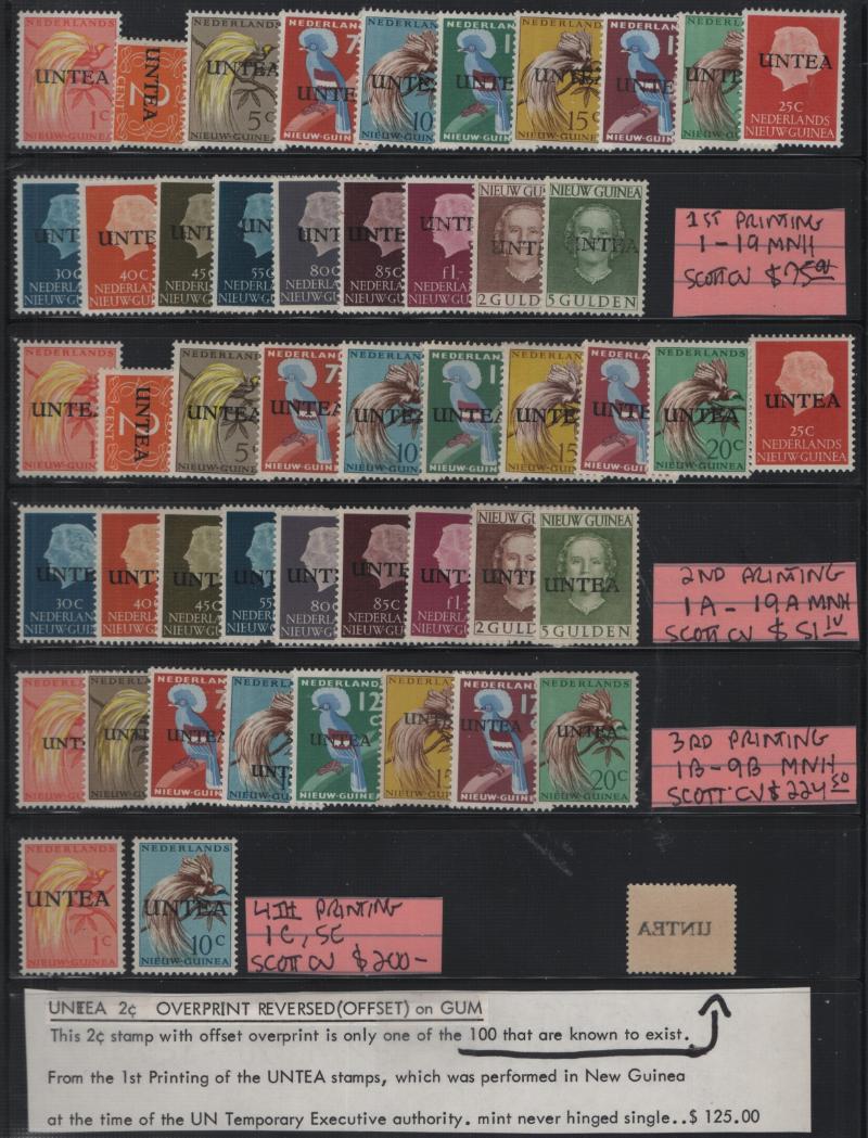 UNTEA West New Guinea Unused NH Collection incl 1st to 4th printings of UNTEA Ovpts, #2 offset error w/ Ovpt on front & gum sides; PBK/30 #1b w/ extra group horizontal perfs in right margin, (2) sets 2nd printing on cacheted FDCs; (4) 15¢ & 35¢ UNTEA stationery; interesting group, gen F-VF NH (Image)