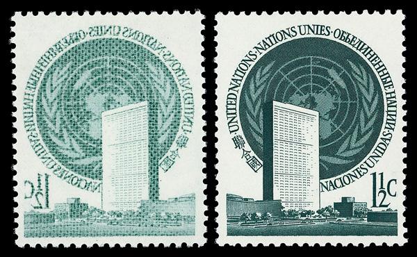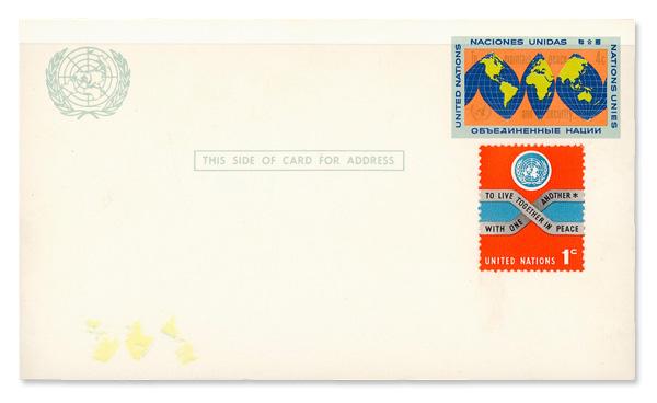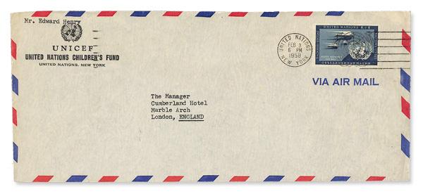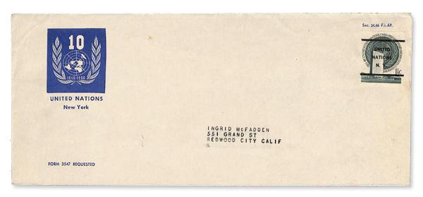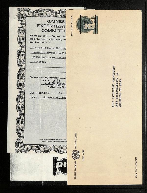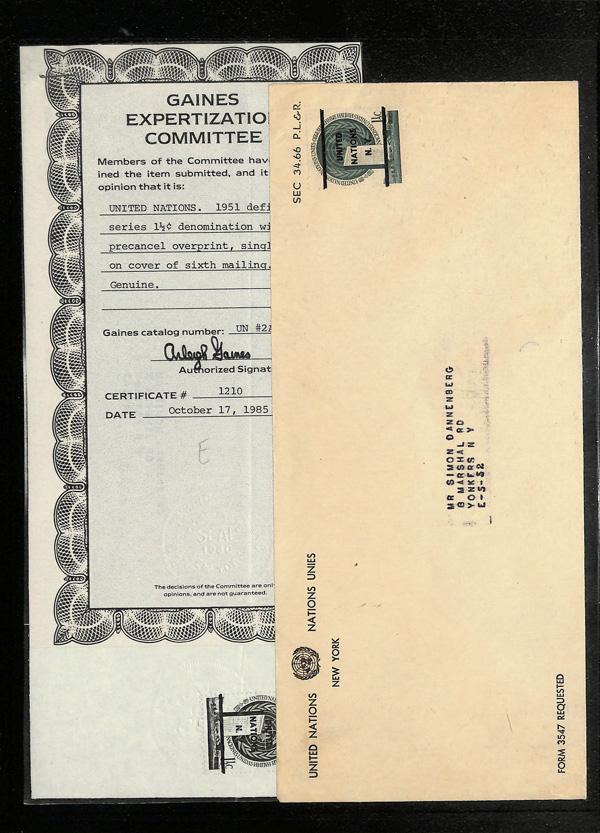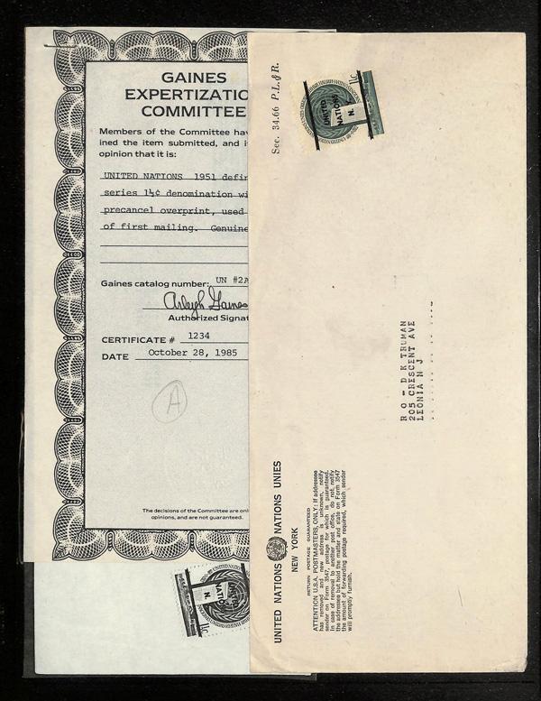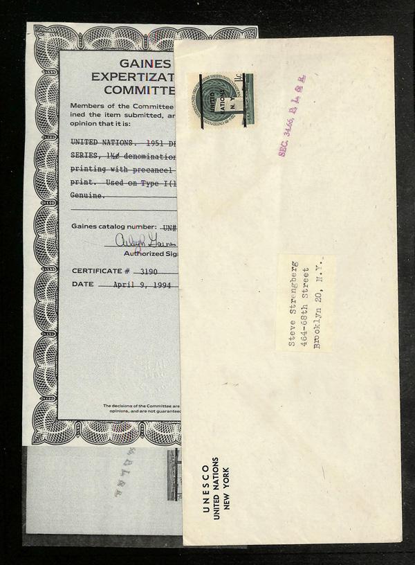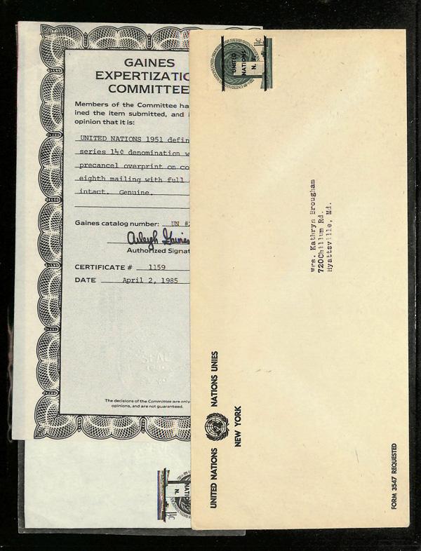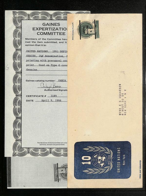 1952, 1½¢ blue green, precancel 'UNITED/NATIONS/N.Y.' (Scott 2 var), 6th mailing cover with modified '&' symbol printed above the stamp, Very Fine, with 1985 Gaines certificate. Gaines 2A. (Image)