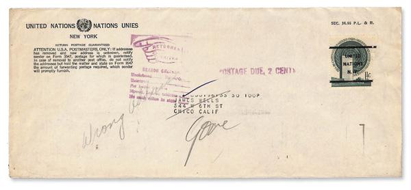 1952, 1½¢ blue green, precancel 'UNITED/NATIONS/N.Y.' (Scott 2 var), 1st mailing cover with Return to Writer & Postage Due 2 cents markings, Very Fine. Gaines 2A. (Image)