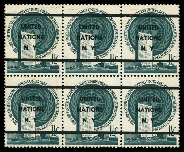 1952, 1½¢ blue green, precancel 'UNITED/NATIONS/N.Y.' (Scott 2 var), block of 6, o.g., never hinged (ink 'G' mark on gum of each stamp), Very Fine. Gaines 2A. Scott $330. (Image)