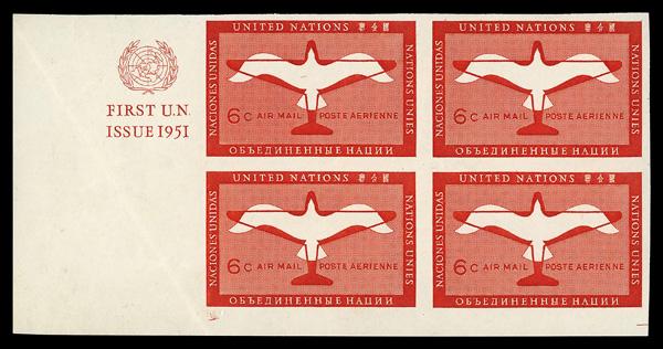 Airmail, 1951, 6¢ henna brown, 1st printing, imperf LL block (Scott C1), inscription block of 4, o.g., stamps never hinged, hinged in selvage only; selvage creases, Very Fine, with 1975 P.F. certificate. Gaines C1.1d. (Image)