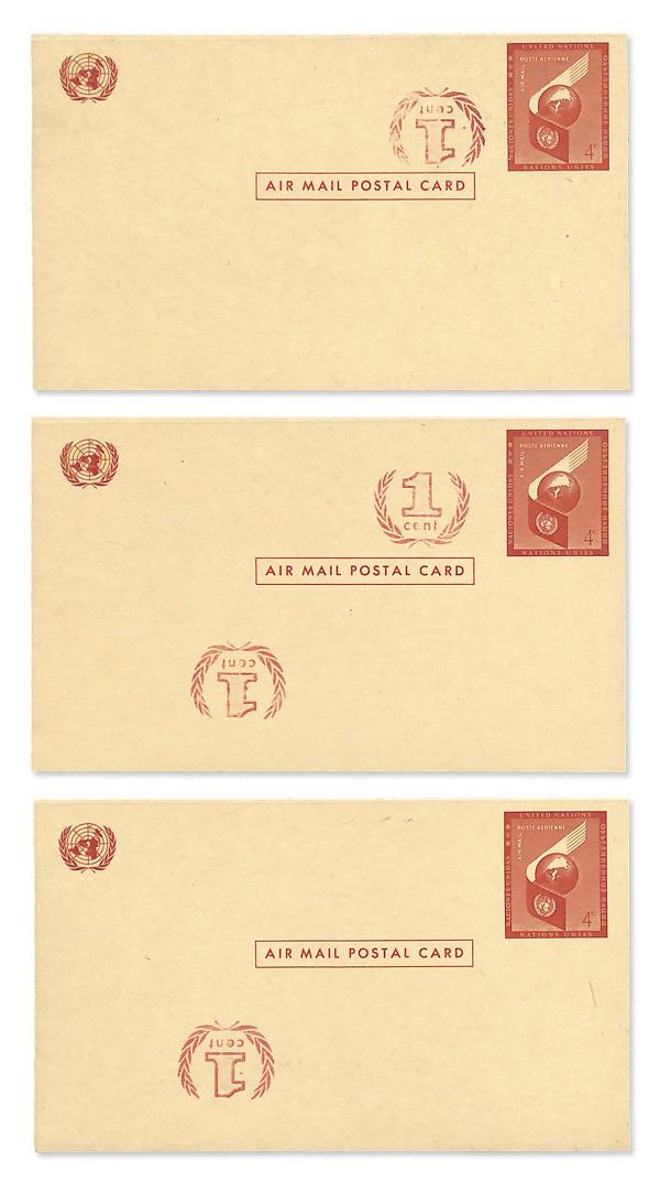 1957, 4¢+1¢ maroon on buff surcharge, inverted & doubled surcharges (Scott UXC3 var), selection of 6 different cards, Extremely Fine, with 1993 Gaines certificate. (Image)