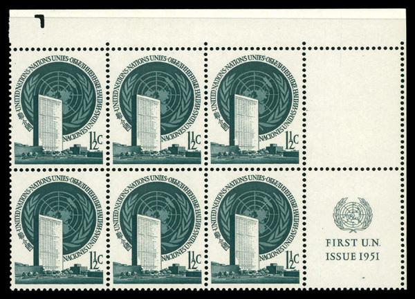 1951, 1½¢ blue green, 1st printing, regular 'L' cutout (Scott 2), inscription block of 6, upside-down press fed error with scarce full gutter perfs at right., o.g., never hinged, Extremely Fine. Gaines 2.1ci. (Image)