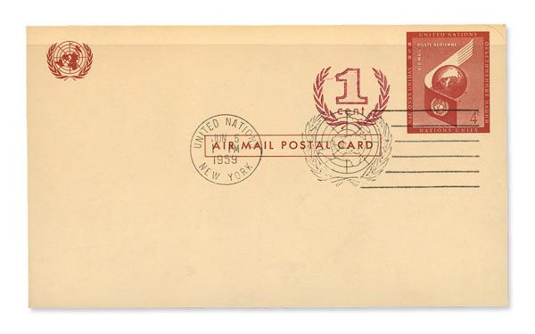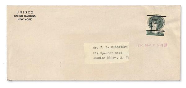 1952, 1½¢ blue green, precancel 'UNITED/NATIONS/N.Y.' (Scott 2 var), 5th mailing cover with comma in rubber stamp after '34.66' variety, Very Fine. Gaines 2A. (Image)