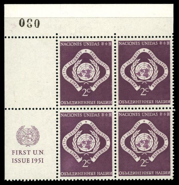 1951, 2¢ purple, inverted control number (Scott 3), inscription block of 4, o.g., never hinged, Extremely Fine. Gaines 3.1d. (Image)