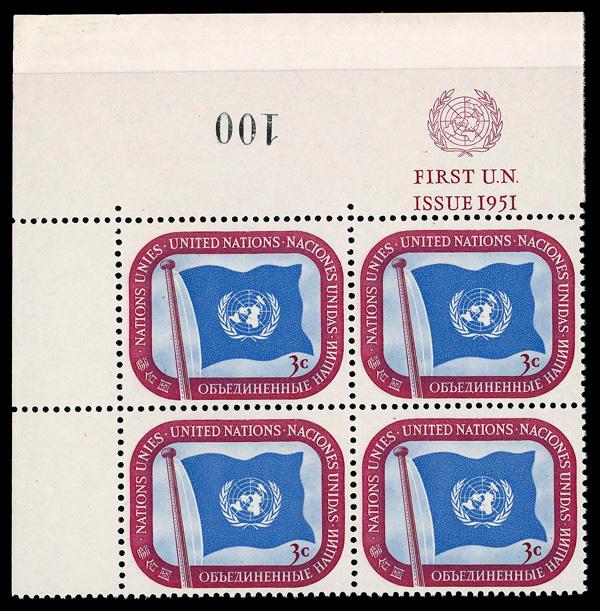 1951, 3¢ magenta & blue, inverted control number (Scott 4), inscriptions block of 4, with additional error inscription block of 4 without control number in correct position., o.g., never hinged; selvage creases on control numer block, Very Fine to Extremely Fine, with 1991 Gaines certificate for pane of 50 showing both errors. Gaines 4.1d. (Image)