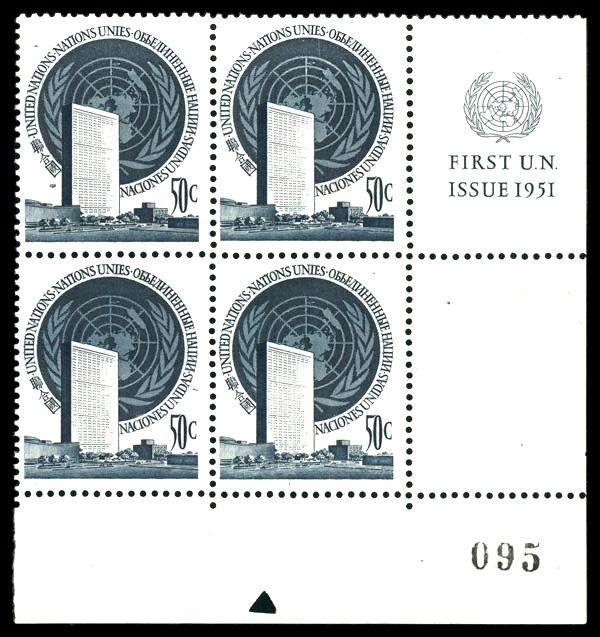 1951, 50¢ indigo, 2nd printing, with control number & triangle cutout LL block (Scott 10), inscription block of 4, o.g., never hinged, Fine to Very Fine. Gaines 10.2b. (Image)