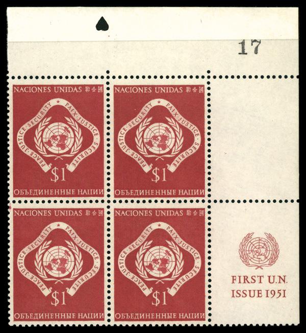 1951, $1 red, 3rd printing, with heart cutout & control number UR block (Scott 11), inscription block of 4, o.g., never hinged, Very Fine. Gaines 11.3ci. (Image)