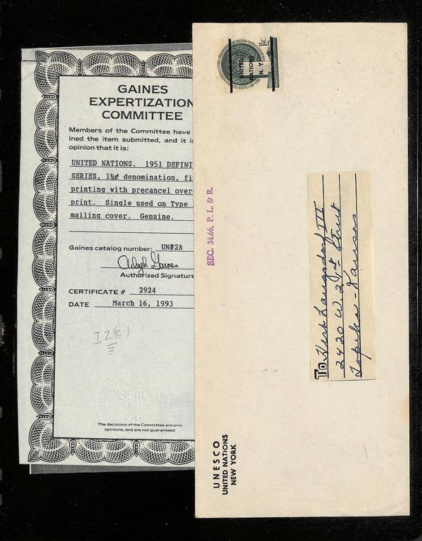 1952, 1½¢ blue green, precancel 'UNITED/NATIONS/N.Y.' (Scott 2 var), 5th mailing cover with comma in rubber stamp after '34.66' variety, Very Fine, with 1993 Gaines certificate. Gaines 2A. (Image)