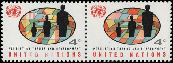 1965, Population Growth, 4¢ multicolor, partial missing colors (Scott 151 var.), small streaks of missing color in the left side of the multicolor oval and somewhat "evanescent" letters in "UNITED NATIONS"; three examples, each slightly different—from very small to much more obvious—two of them are the left stamps in a block of 4 with two normal, the third is the left stamp in a pair with a normal, o.g., never hinged, Extremely Fine. (Image)