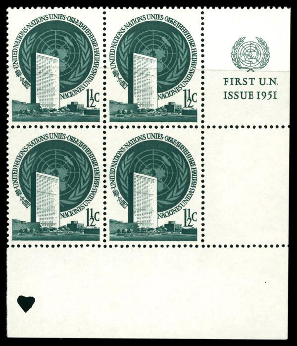 1951, 50¢ indigo, 2nd printing, with triangle cutout LL block (Scott 10), inscription block of 4, o.g., never hinged; small internal creases, Very Fine to Extremely Fine. Gaines 10.2ci. (Image)