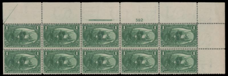 1898, 1c TRANS-MISSISSIPPI TOP IMPRINT & PLATE #592 BLOCK OF 10 MINT NEVER HINGED, #285, fresh, fine-very fine, cat. $1,100.00 (Image)