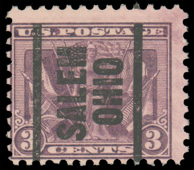 1919, 3c DEEP RED VIOLET USED, #537a, bold and vibrant color, Salem Ohio pre-cancel, full o.g. lightly hinged, fresh and fine, with photocopy of 2021 P.F. cert for block of four of which this is the bottom left stamp, rare shade variety, cat. $1,750.00 as fine (Image)