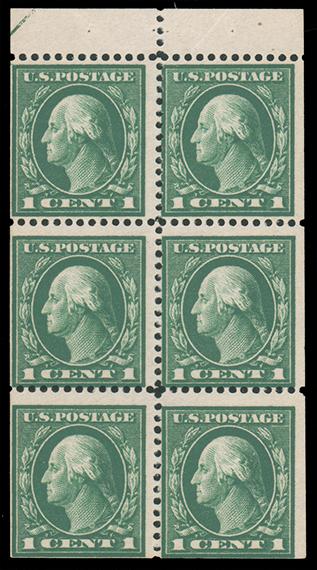 1912, 1c GREEN BOOKLET PANE OF SIX NH, #405b, partial arrow at top left, slight natural gum bend, fine, cat. $110.00 (Image)