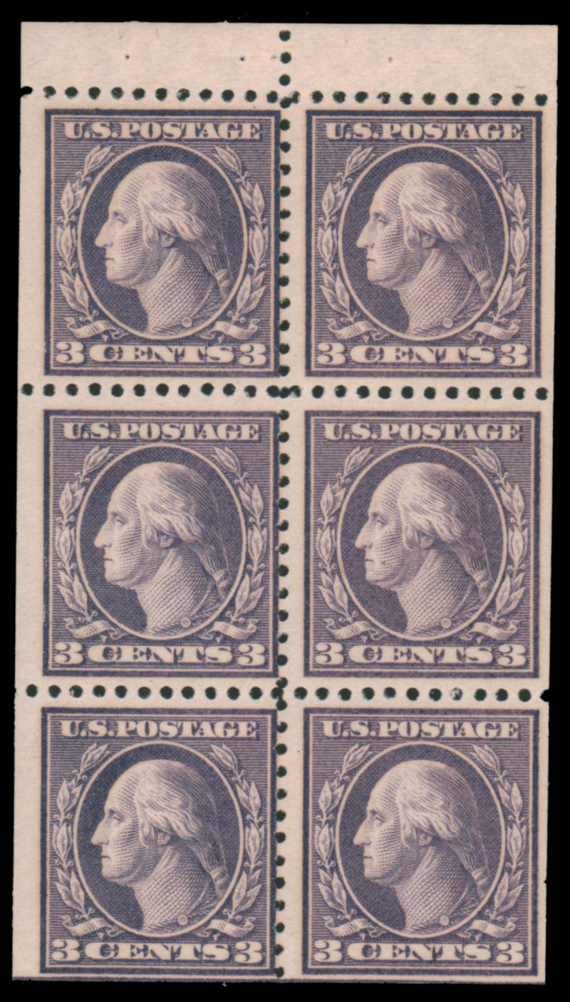 1918, 3c DARK VIOLET BOOKLET PANE OF SIX NH, #502b, guide line at bottom, top right stamp tiny natural gum skip, fine, cat. $100.00 (Image)
