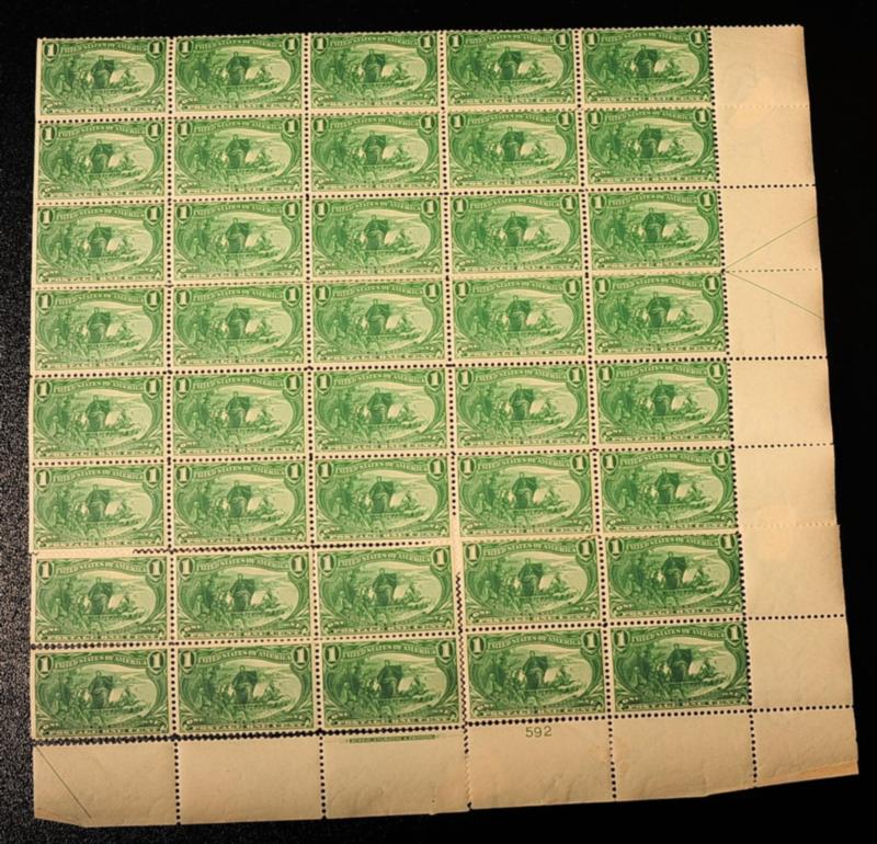 1898, 1c TRANS-MISSISSIPPI BLOCK OF 40, #285, numerous perf. separations also affecting the plate block at bottom, 33 stamps mint never hinged, six stamps with hinge reinforcements, one stamp with thin spot, overall fine-very fine, cat. $2,667.50 as single stamps (Image)