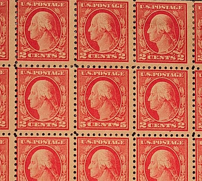 1917, 5c ROSE (DOUBLE ERROR) IN FULL PANE WITH NORMAL STAMPS, #505 (499), hinge reinforced around the edges, both errors mint never hinged along with all stamps exception the straight edges along the edge of the sheet, overall fine-very fine, cat. $1,250.00 as two NH errors (Image)