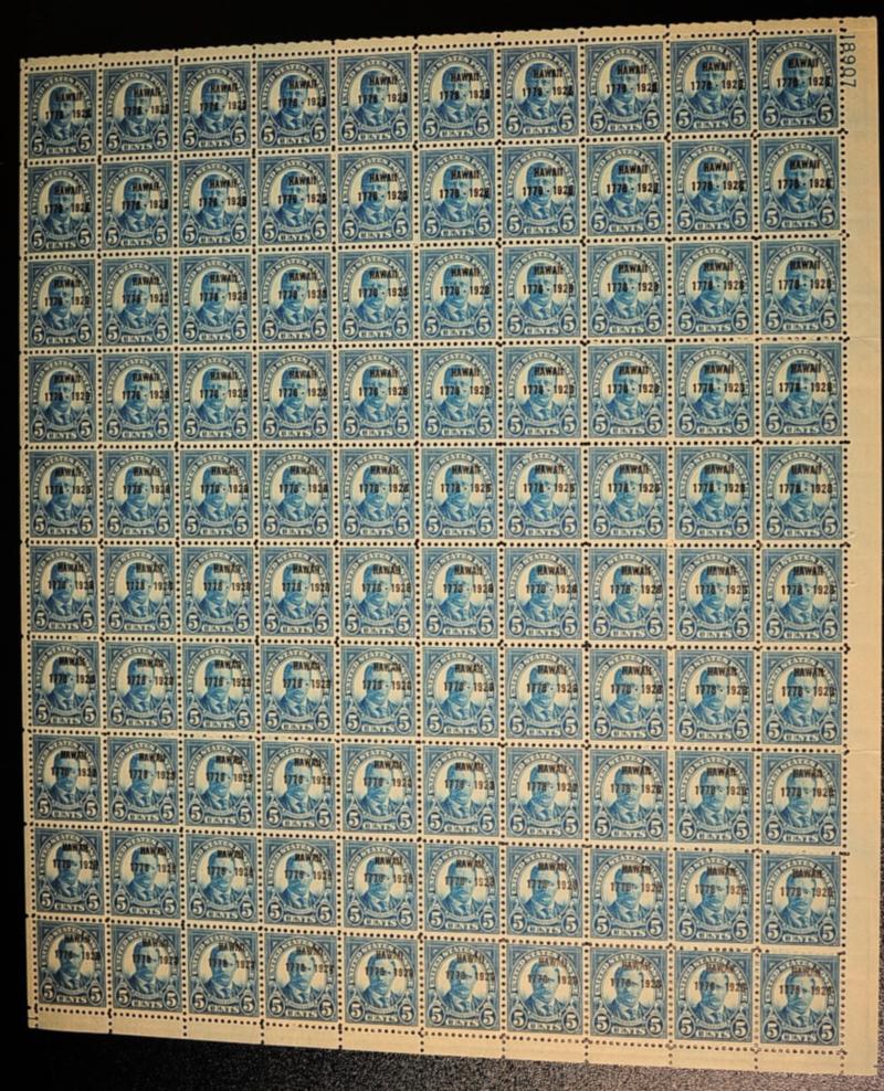 1928, 5c DARK BLUE HAWAII COMPLETE PANE OF 100, #648, plate #18907, mint never hinged, fine-very fine, cat. $2,439.00 (Image)