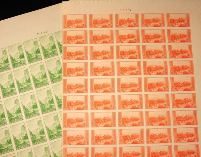 1935 NATIONAL PARKS IMPERF SET IN COMPLETE PANES OF 50, #756-765, without gum as issued, very fine, cat. $936.75 (Image)