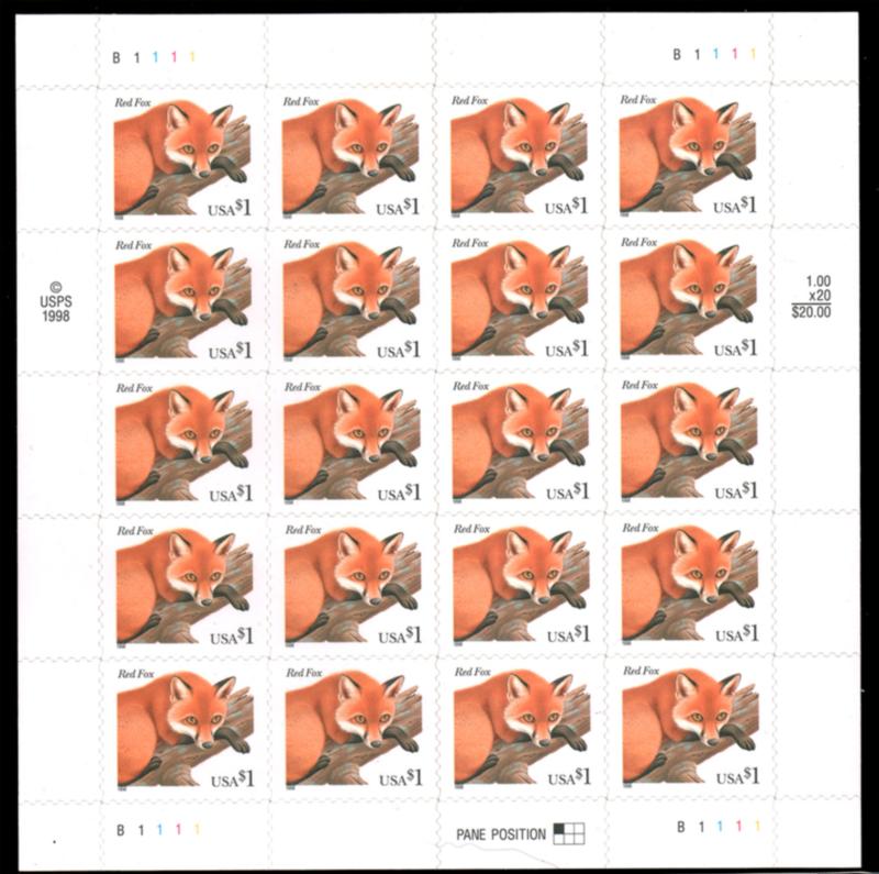 1998, $1 RED FOX PANE OF 20, #3038, very fine, cat. $200.00 (Image)