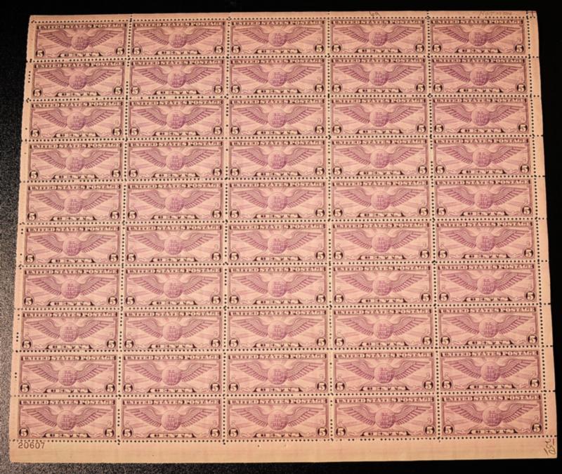 1931, 5c GLOBE ROTARY AIR POST COMPLETE PANE OF 50, #C15, mint never hinged, plate #20607, fine-very fine, cat. $486.00 (Image)