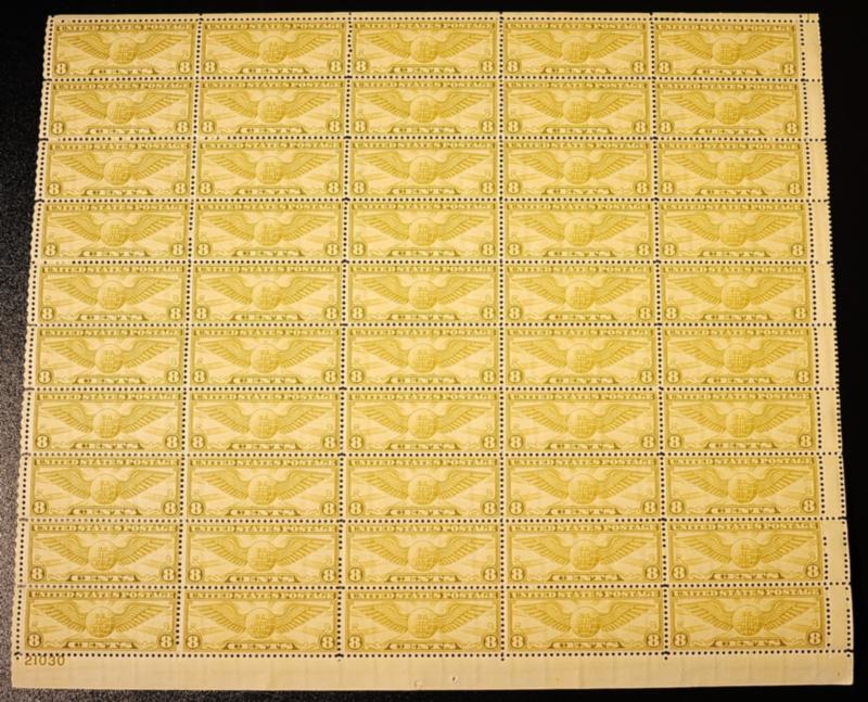 1932, 8c GLOBE AIR POST COMPLETE PANE OF 50, #C17, mint never hinged, plate #21030, fine-very fine, cat. $210.00 (Image)