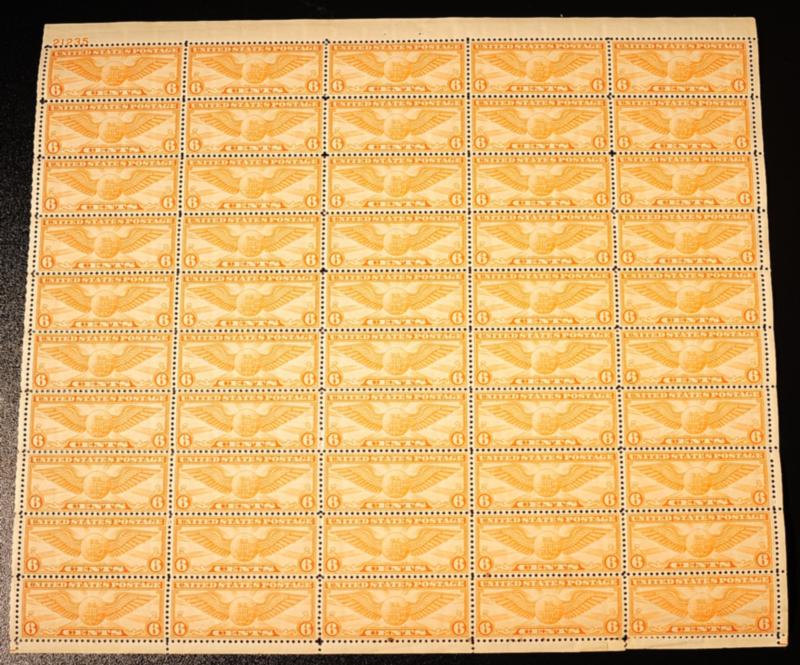 1934, 6c GLOBE AIR POST COMPLETE PANE OF 50, #C19, mint never hinged, plate #21235, slight toning spots on the bottom two rows, fine-very fine, cat. $174.00 (Image)