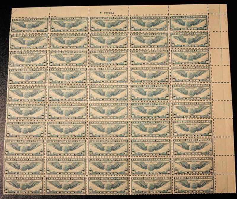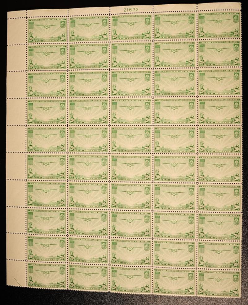 1939, 30c GLOBE AIR POST COMPLETE PANE OF 50, #C24, mint never hinged, slight natural gum bends, fine-very fine, cat. $594.00 (Image)