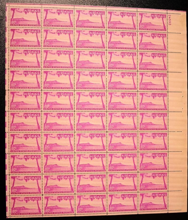 1952, 80c HAWAII AIR POST COMPLETE PANE OF 50, #C46, mint never hinged, plate #24593, very fine, cat. $226.00 (Image)