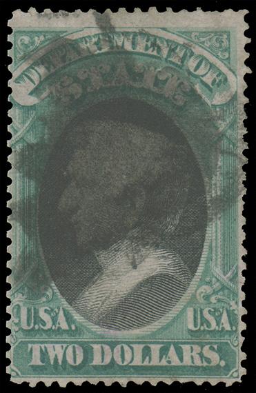 1873, $2 GREEN & BLACK STATE USED, #O68, bold cancel, reperfed at left, short perf at top, fine, signed Roumet and others, cat. $3,000.00 (Image)