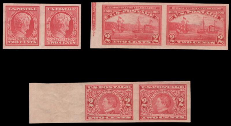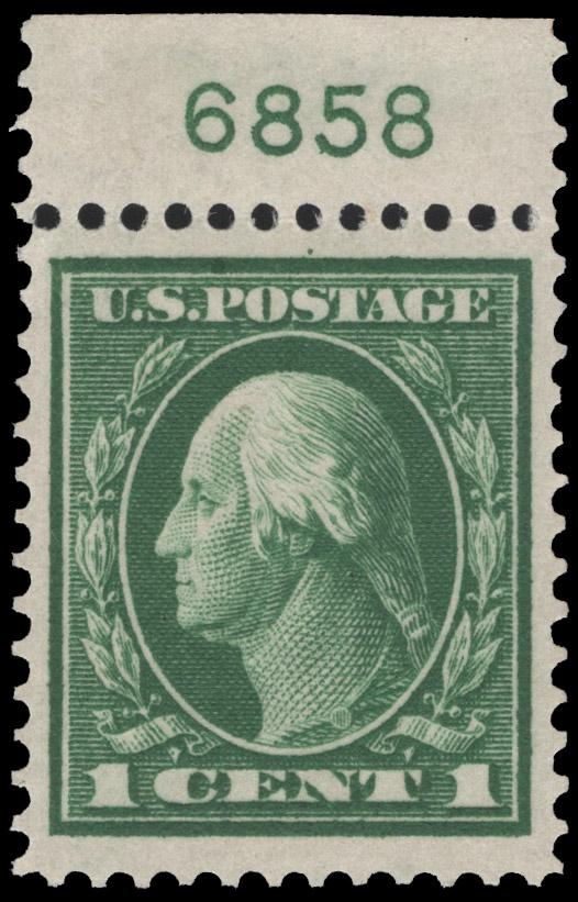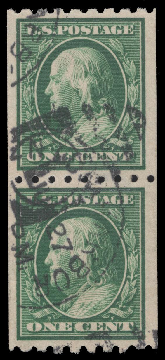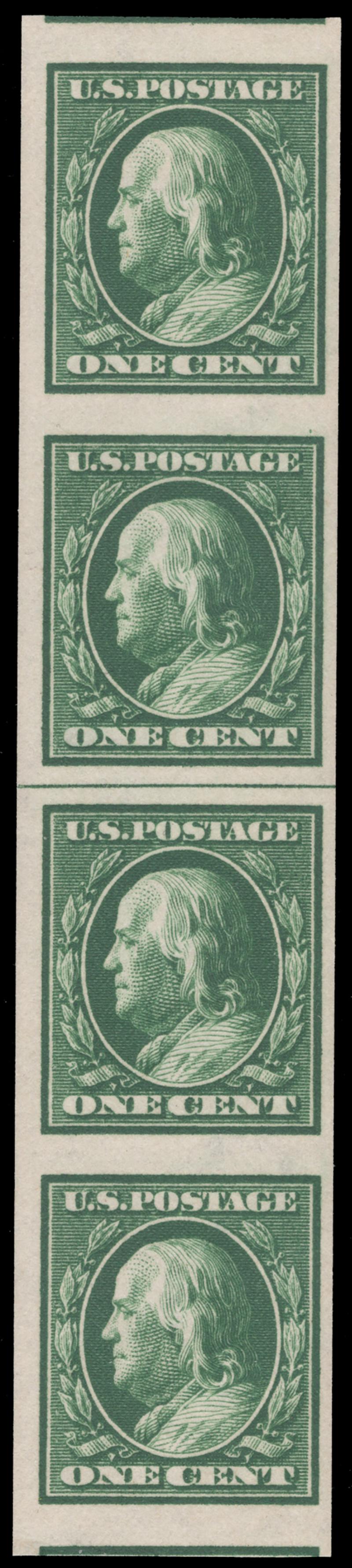 1910, 2c CARMINE SINGLE LINE WMK BOOKLET PANE OF SIX, #375a, showing guide line and arrow at left, small h.r., very fine, cat. $125.00 (Image)