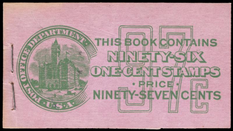 1c GREEN COMPLETE 97c BOOKLET WITH GREEN & LAVENDER COVERS, #BK42, complete unexploded mint never hinged booklet with 16 panes of #424d, of which six show guide line either at left or right, light toning around edges of cover, fine-very fine, cat. $140.00 (Image)