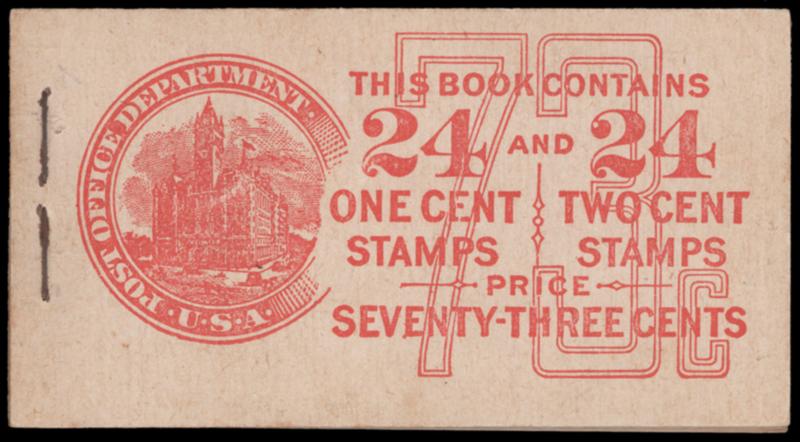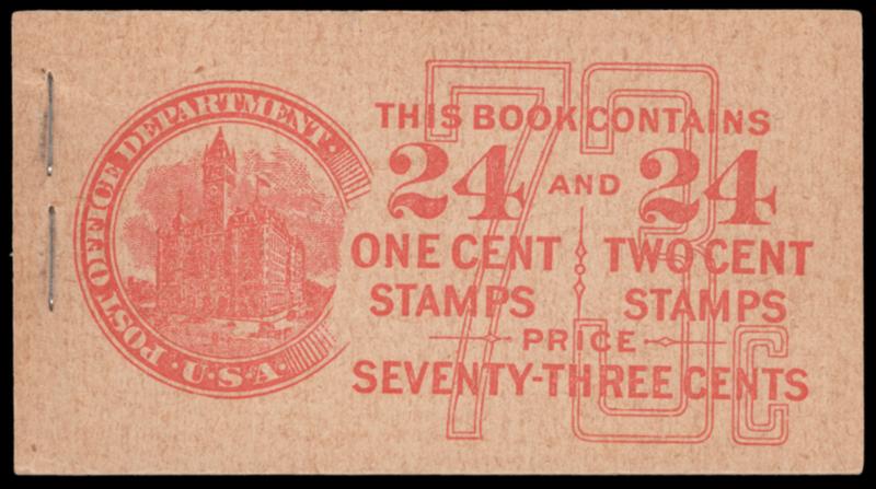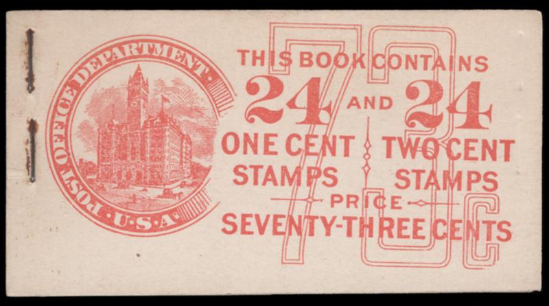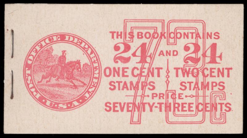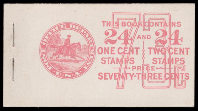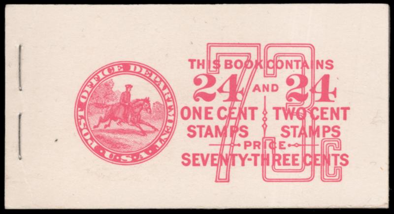 1c GREEN + 2c CARMINE COMPLETE 73c COMBINATION BOOKLET WITH RED & WHITE COVERS, #BK79, cover type IVc, complete unexploded mint never hinged booklet with 4 panes of #632a and 4 panes of 634d, all 2c panes showing guide lines at left, fresh and very fine, cat. $85.00 (Image)