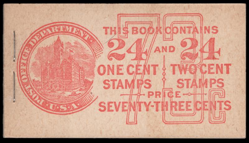 1c GREEN + 2c CARMINE COMPLETE 73c COMBINATION BOOKLET WITH RED & BUFF COVERS, #BK56, cover type IIj, complete unexploded mint never hinged booklet with 4 panes of #498e and 4 panes of 499e, fresh and very fine, cat. $75.00 (Image)