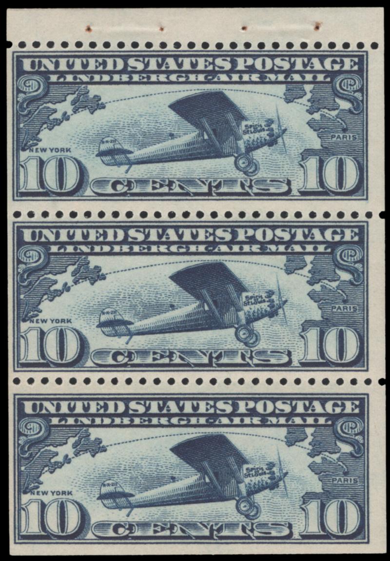 1927, 10c LINDBERGH AIR POST BOOKLET PANE OF THREE NH, #C10a, fresh, fine-very fine, cat. $115.00 (Image)