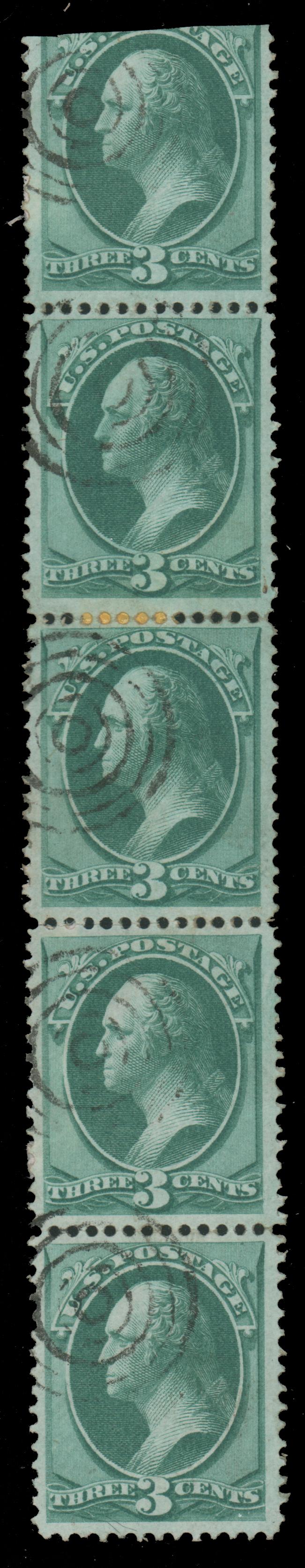 1870, 3c GREEN "H" GRILL STRIP OF 4½ USED, 136, well-centered with target cancels, fine-very fine, rare multiple (Image)