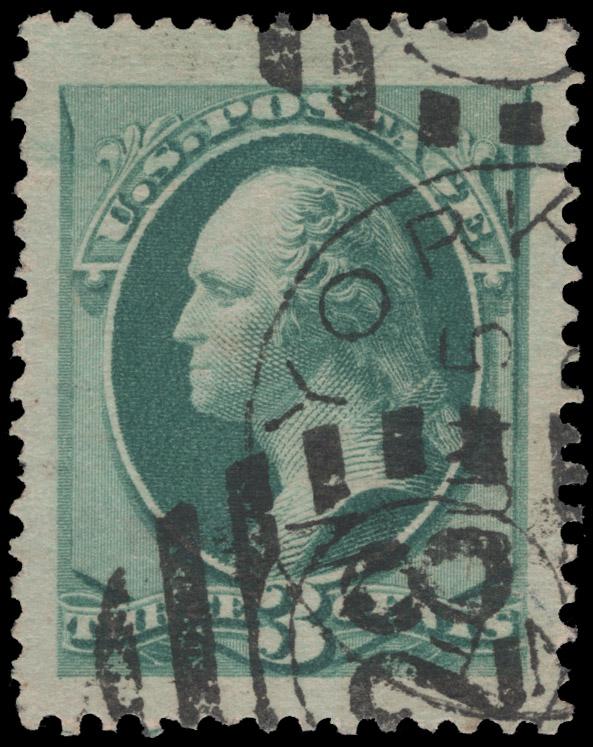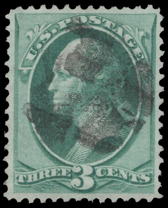 1870, 3c GREEN 'H' GRILL USED GRADED '90', #136, well-centered with neat cork cancel, extremely fine, with 2008 PSE cert. graded '90', SMQ $210.00 (Image)