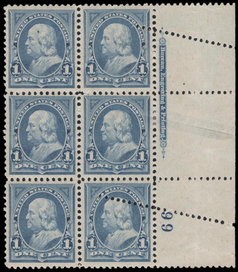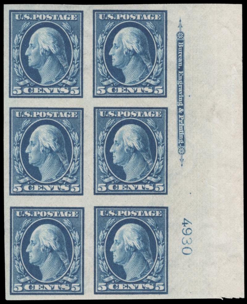 1909, 5c BLUE DOUBLE LINE WMK IMPERF RIGHT IMPRINT & PLATE #4930 BLOCK OF SIX NH, #347, pristine and very fine, cat. $500.00 (Image)