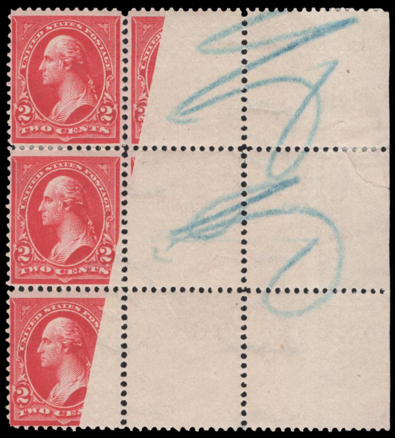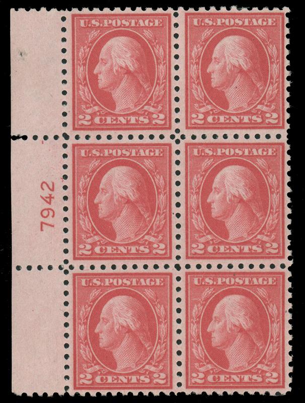 1916, 2c CARMINE PERF 10 UNWMK LEFT PLATE #7942 BLOCK OF SIX FROM THE 5-CENT ERROR SHEET NH, #463 (467), fresh, extremely fine, cat. $250.00 (Image)
